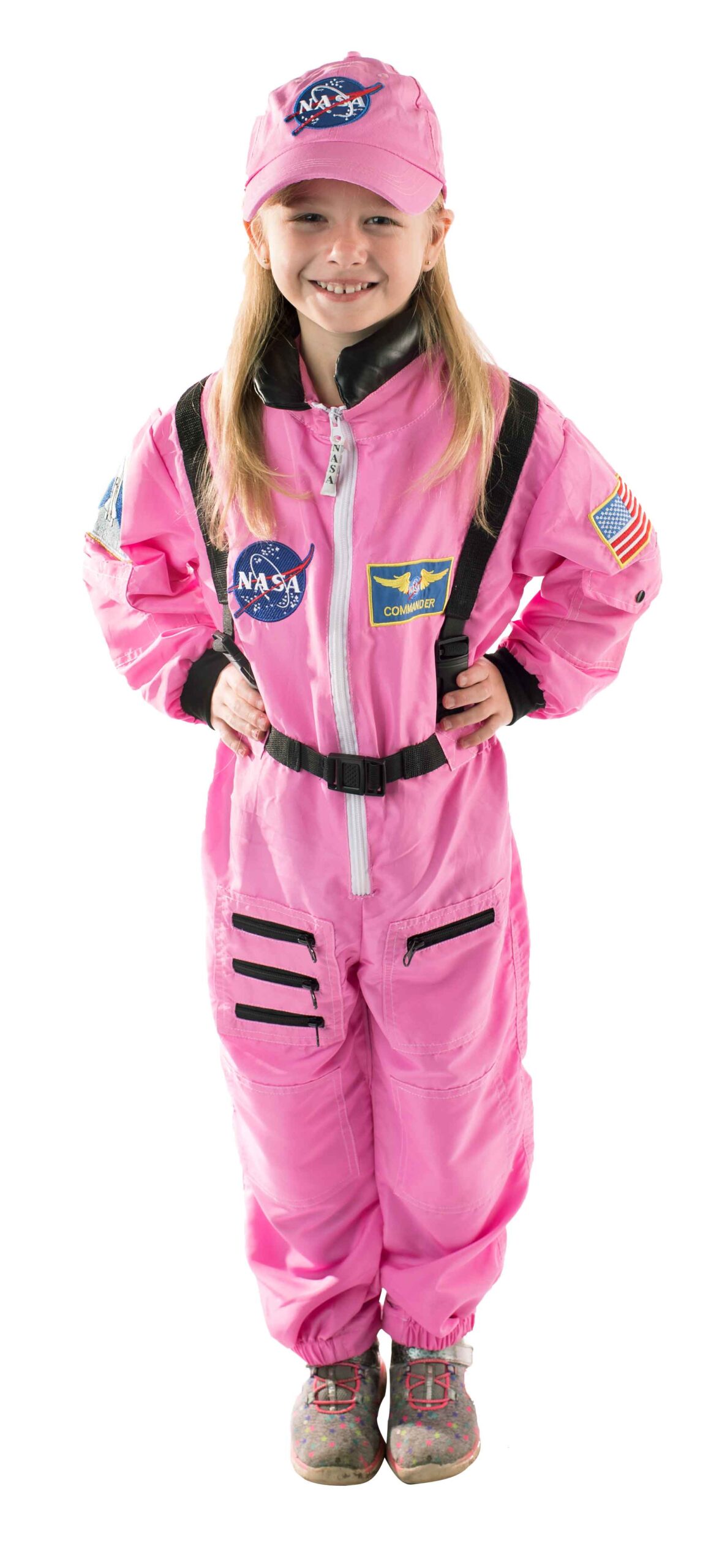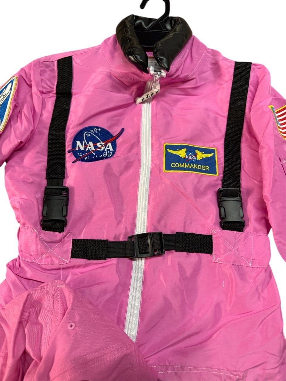 This top-quality Pink Astronaut Suit comes with an embroidered NASA cap and all the official styling of our standard suits—but with a slight imperfection. Current discounted suits feature misaligned front patches (see photos for example).